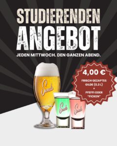 Unser Angebot für Studierende gilt jeden Mittwoch (den ganzen Abend!): Frisch Gezapftes Gilde (0,3l) + Pfeffi oder „Ficken“ für 4,00 Euro.